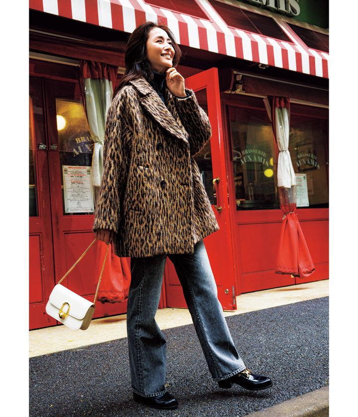主張の強めの柄もブラウンの柔らかさがあれば、くどくならず大人にも取り入れやすい。パッと目を引くレオパードのアウターはコンサバ感を控えめに、少しモードに着こなすのが洒落見えのコツ。