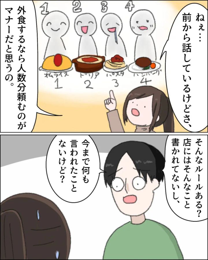私はこれまで何度も話しているマナーの話をもう一度夫に伝えることになりました。「外食するなら人数分頼むのがマナーだと思うの。」等云うと、夫は「そんなルールある?店にはそんなこと書かれてないし、今まで何も言われたことないけど?」と埒が明かない。私は唖然としてしまいました。