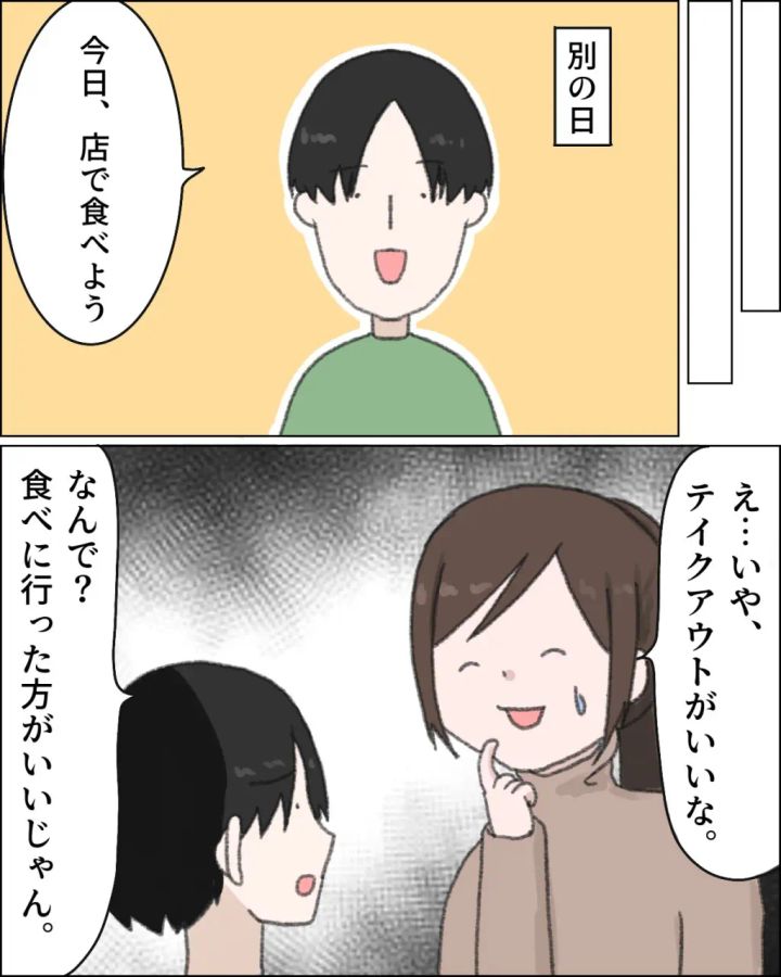 別の日、夫が外で食べようと提案してくれましたが、私は躊躇してしまいました。「テイクアウトがいいな。」夫はキョトンとして「なんで?食べに行った方がいいじゃん。」