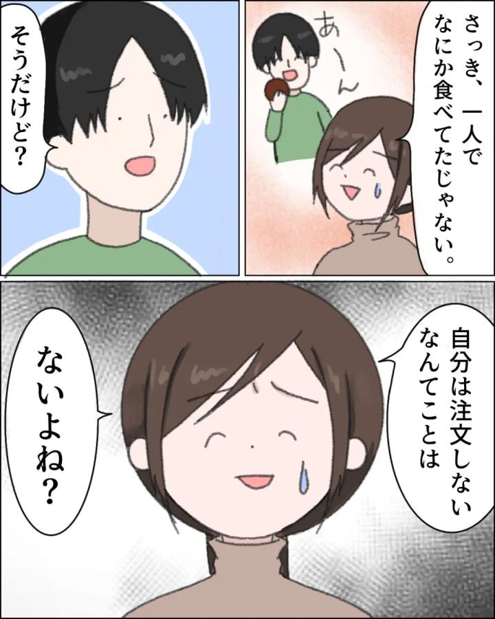 「イヤなの。この間なんて、私の注文したうどん食べるって言い出したでしょ?」具体的に説明しても、夫には通じないようで「何がダメなの?」とまだ驚いた顔をしています。