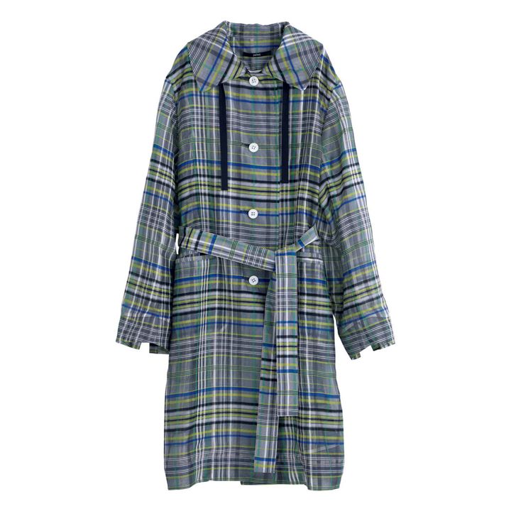 グレーベースで大人の女性でも着こなしやすい〈ペレック〉のチェック柄コート。シルクオーガンジーにキュプラと細番手のコットンを織り交ぜたオリジナル生地を使い、シアーな仕上がりに。ハリ感がありつつ、しなやかな肌触りも魅力。シンプルなデザインながら、袖口のスリットや、襟元のストリング、ボタンの位置などで、遊び心をプラス。