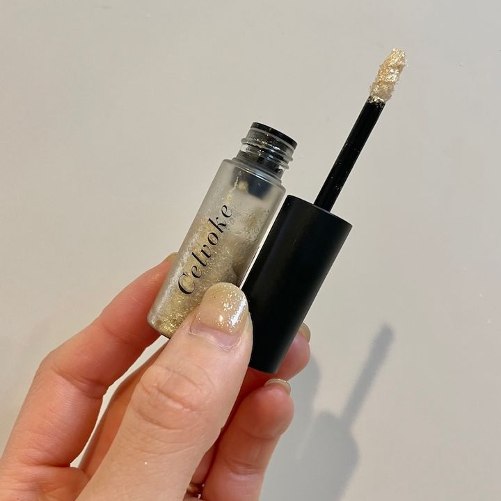 マルチに使えるゴールドラメ入りのリキッドカラーを1本持っておくと、ひと塗りで華やかさをプラスすることができて便利です。ラメ使いもゴールドなら肌浮きせず、大人の肌にもマッチ。のせる場所は、目頭と頬骨の上。程よいキラキラ感で表情が明るくなります。特別感が出るので謝恩会などの場にもおすすめ。