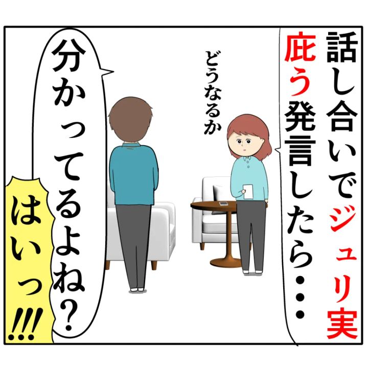 「話し合いでジュリ実を庇う発言したらどうなるか・・分かってるよね?」めいさんがろみ緒さんにそう言うと、「はいっ!!!」直立不動で返事をするろみ緒さん。
