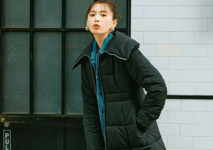 中綿ロングコート¥20,900/MERCURYDUO(MERCURYDUO ルミネエスト新宿店) デニムジャケット¥22,000/ヘルシーデニム(アンタイトル) ロンT ¥990/GU パンツ¥24,200/アンタイトル イヤリング¥8,800/アビステ バッグ¥13,200/ スリードッツ(スリードッツ表参道店) メリージェーン¥17,600/ダイアナ(ダイアナ 銀座本店)