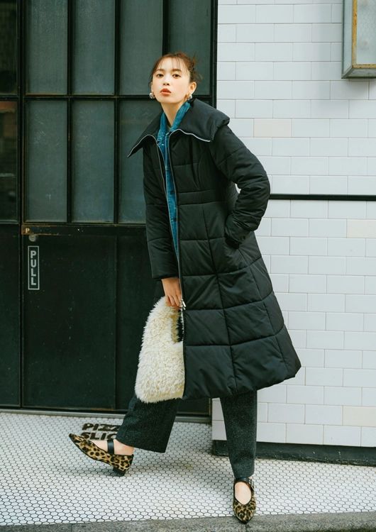 黒のロングダウンは旬のレイヤードでnotコンサバに