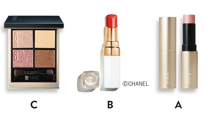春の注目は色付きハイライト。ツヤ肌ベースを作りAをチーク感覚で頬に広く入れ、鼻筋と顎先にものせる。チークレスでも1本で血色をプラス。Bを指に取り、唇の上下の中央をさらっとなぞったら全体にのばす。輪郭はボケていてもOK。Cは左上をアイホール全体に薄くのせ、右上と下2色の3色を混ぜて上下瞼の目頭から3分の2まで入れる。目尻はダークブラウンのアイラインで締めて。
