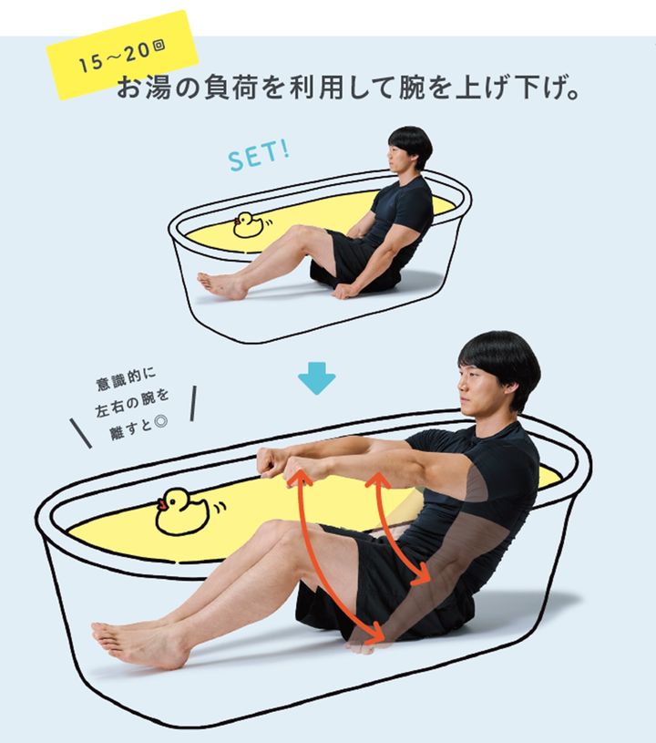腕を上下する単純な動作も、お湯の負荷で立派な筋トレに。「ポイントは左右の腕を意識的に離すこと。首と肩の筋肉は繋がっているため、腕同士が近いと二の腕ではなく首を鍛えてしまうので要注意」