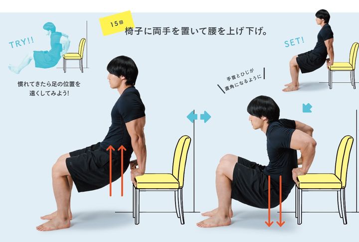 【二の腕に効く!】椅子に両手を置いて腰を上げ下げ(15回)。