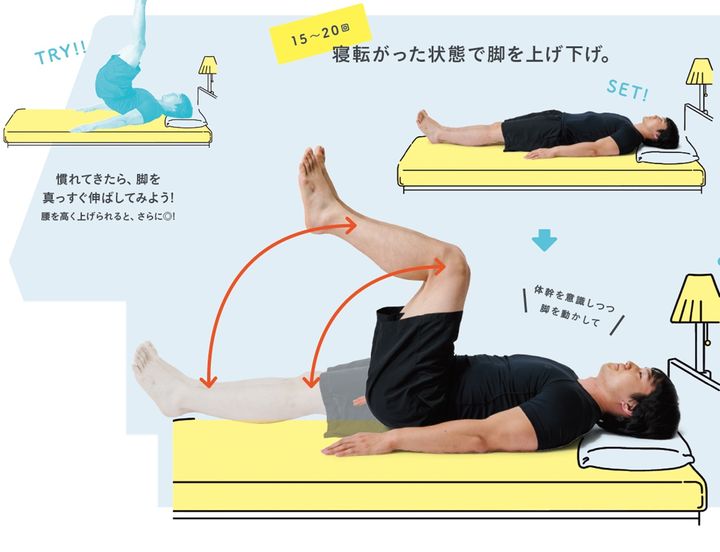 【腹筋に効く!】寝転がった状態で脚を上げ下げ(15~20回)。