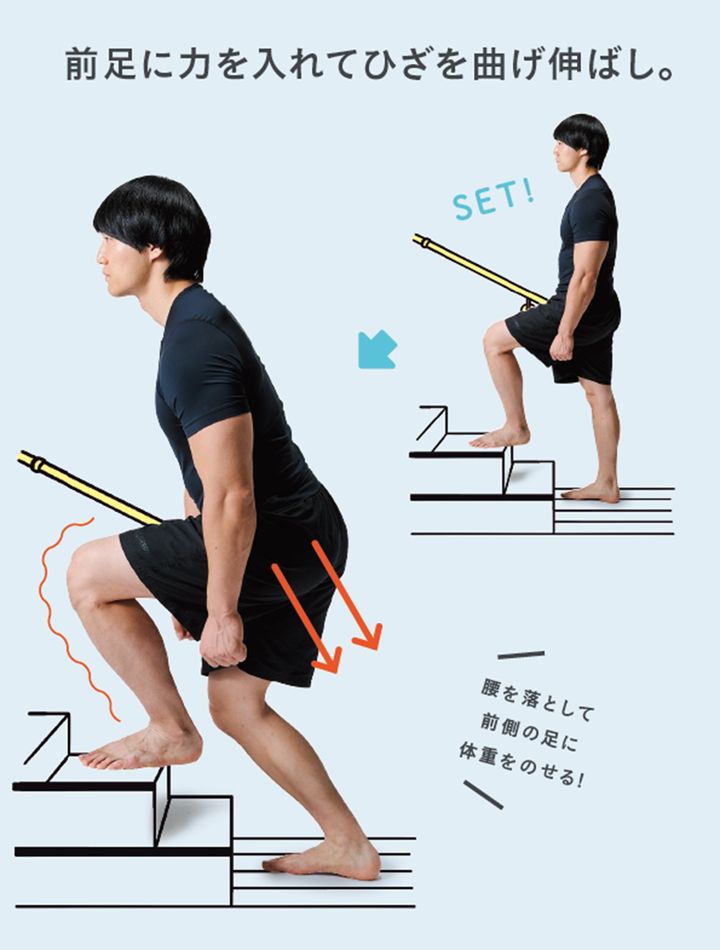 1アクション加えることで、階段の運動効果がさらにアップ! 「1段飛ばした状態で、前足に体重をのせて腰を下に落としましょう。お尻の筋肉にかなり効くので、続けるとヒップアップが叶います」