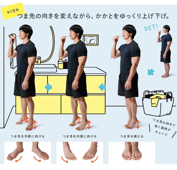 上半身しか使わない歯磨きタイムは、ふくらはぎの筋トレに最適。「つま先の向きを変えることで、バランスよく筋肉がつきます。かかとを上げきること&床ギリギリまでかかとを下げる点がコツ」