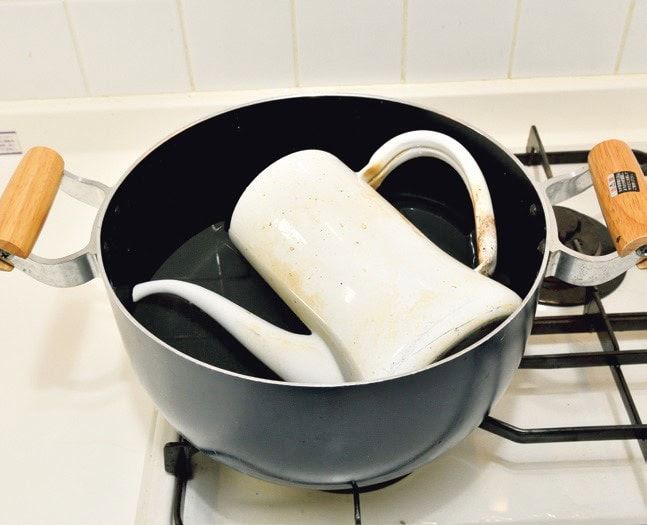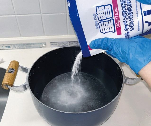 鍋に、ホーローポットが隠れるくらいの水を入れ、重曹を適量加える。汚れがひどい場合は、重曹を多めに加えるなどして濃度を調整する。