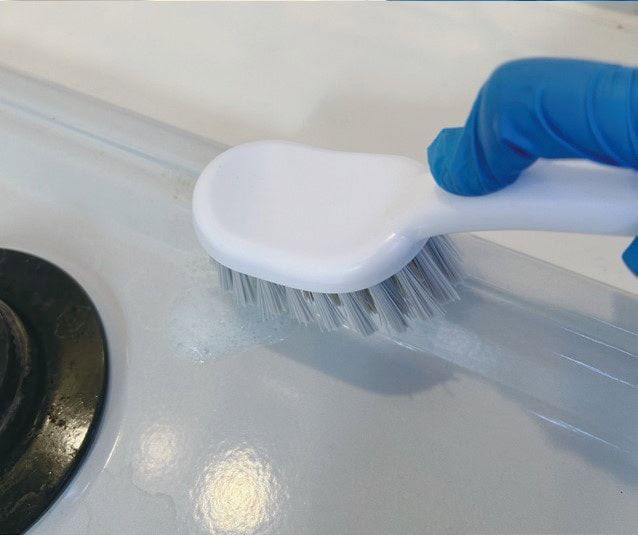 ブラシでこすって洗う。窓用サッシブラシを使うと掃除しやすい。