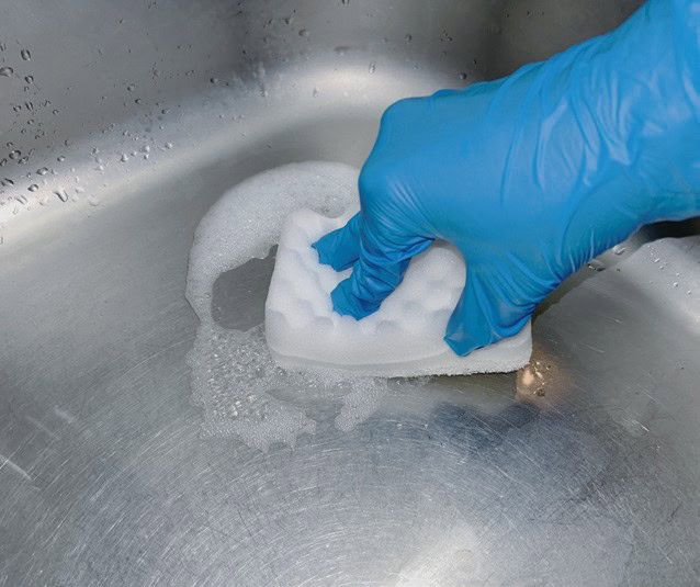 ぬめりが気になる部分にアルカリ性洗剤を吹きかけてスポンジで洗う。