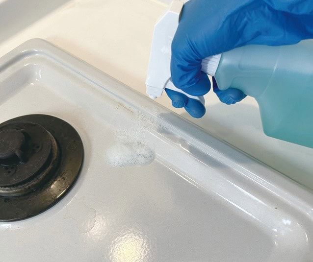 コンロ周辺の汚れた部分に、アルカリ性洗剤を吹きかける。