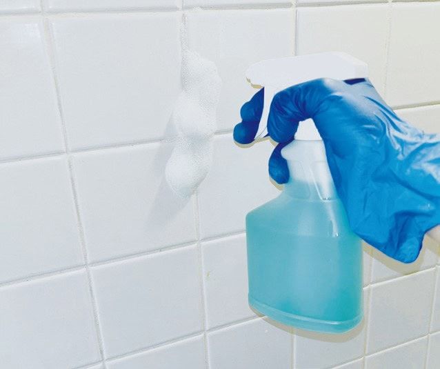 タイルの目地にアルカリ性洗剤を吹きかける。