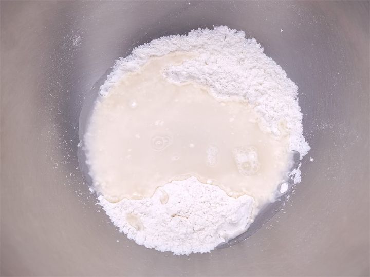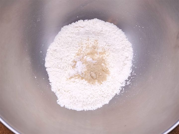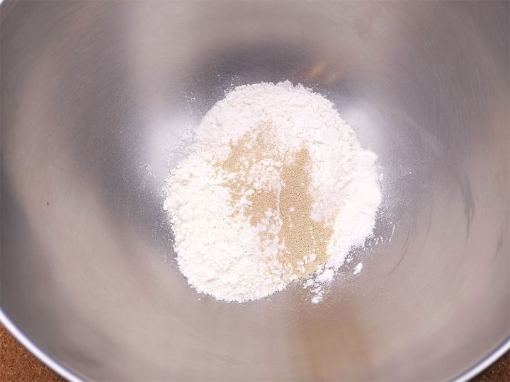 1. ボウルに強力粉、薄力粉、ドライイーストを入れて混ぜあわせます。