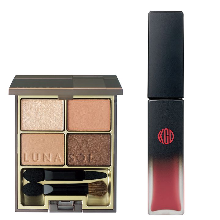 (左)ルナソル スキンモデリングアイズ02 ¥5,500(カネボウ化粧品)(右)リキッドルージュ ラスティング カラーバーム 02 ¥2,970(Koh Gen Do)