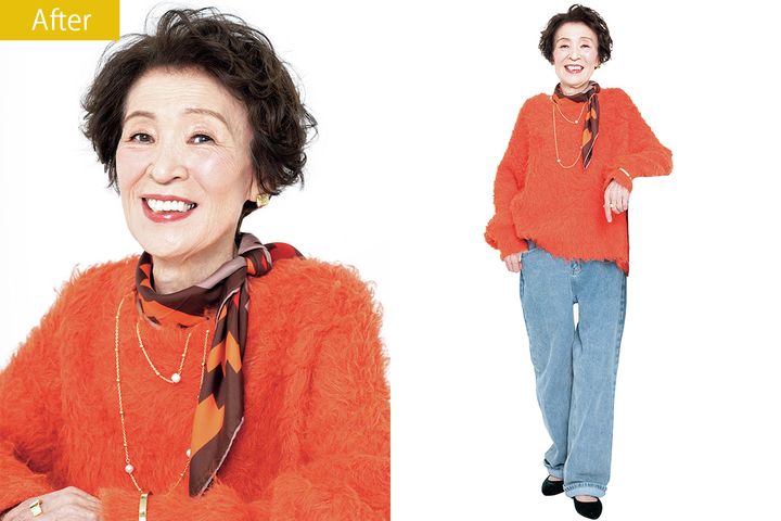 「こんな色味のお洋服は初めて着ました!孫と一緒に似たものを早速買いに行ったほど嬉しかったです。いただいたリップも毎日使っています。撮影のおかげでお洒落は楽しいと、昔の気持ちが蘇りました」