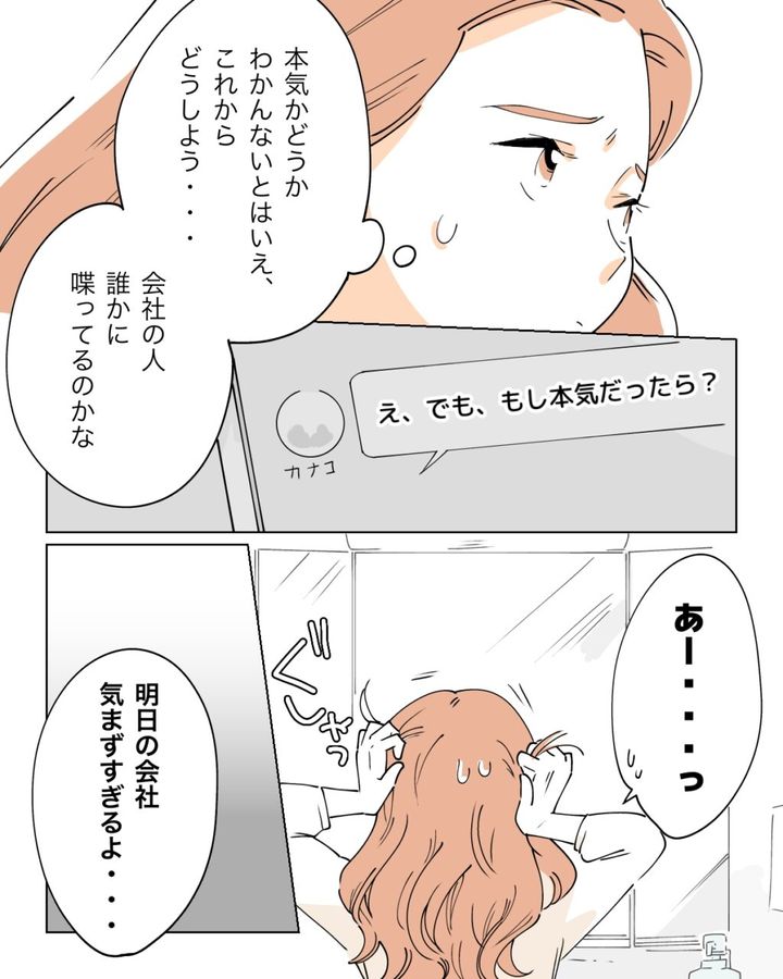 加賀谷君が本気かどうかわからないとはいえ、これからどうしよう、と私の中で不安な気持ちも湧いていた。会社の人、誰かにしゃべってるのかな。カナコの『もし本気だったら?』というひと言が何度も脳裏に浮かぶ。明日の会社、気まずすぎる。