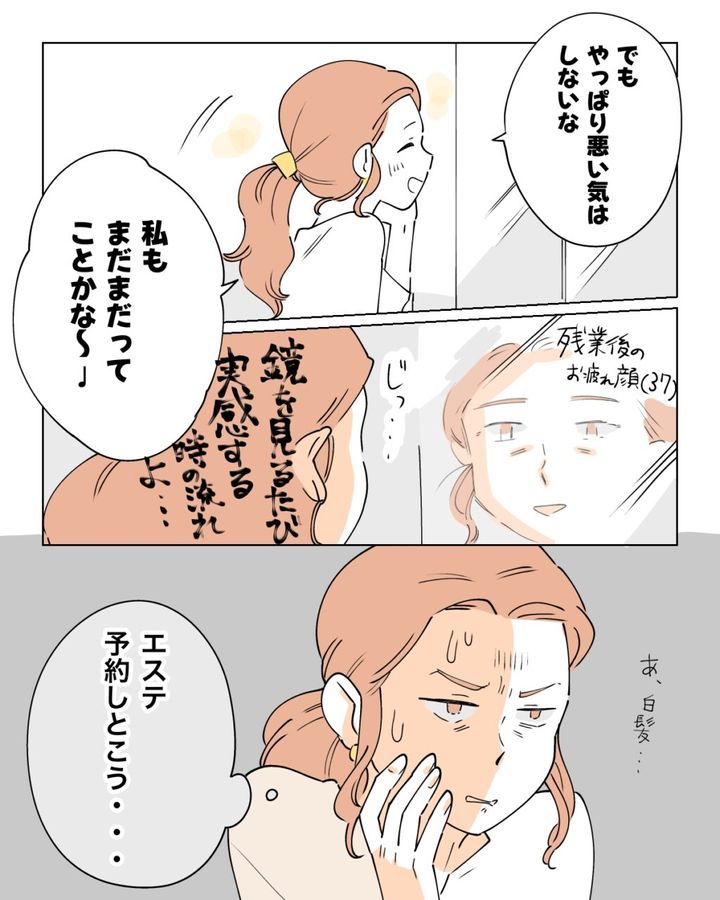 でもやっぱ、悪い気はしないな。私もまだまだってことかな。と、だんだん喜びの気持ちが芽生えてきた。鏡に映った疲れ切った自分の顔を見て、エステを予約したけれど。