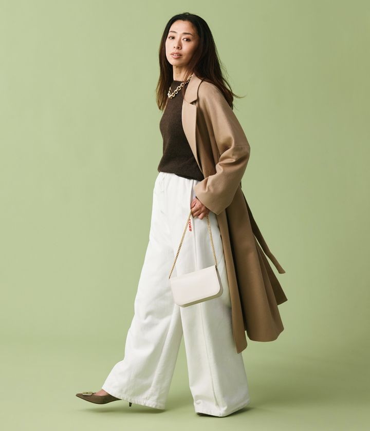 スウェットパンツ¥13,750(メゾンスペシャル/メゾンスペシャル 青山店)キャメルコート¥148,500(アルアバイル)ニット¥28,600(スローン/ザ ショップ スローン 神戸)バッグ¥69,300〈マエストソ〉パンプス¥82,500〈ペリーコ〉(ともにアマン)ネックレス¥13,200(アビステ)