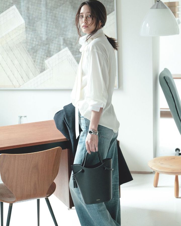 ジャパン)シャツ¥40,700(IRENE/リステア/ルシェルブルー総合カスタマーサービス)デニム¥46,200(ディーゼル/ディーゼル ジャパン)コート¥50,600(ハウント/ハウント代官山〈ゲストリスト〉)バッグ¥39,600(オルセット/オルサ)メガネ(スタイリスト私物)