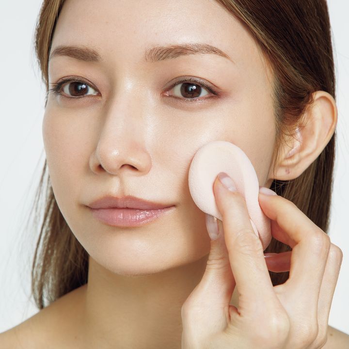 塗り広げるのはスポンジで。手早く広げると薄膜肌に仕上がります。カバーしたい箇所は指先にとりコンシーラーのように重ねづけ。