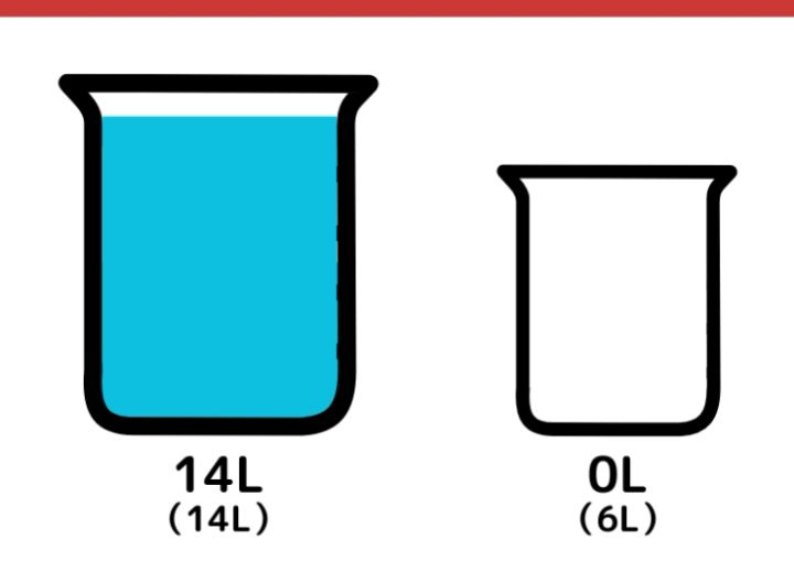 14L容器から6L容器に水を移します。この時点でそれぞれの容器は、次の通りになります。14Lの容器→8L、6Lの容器→6L。