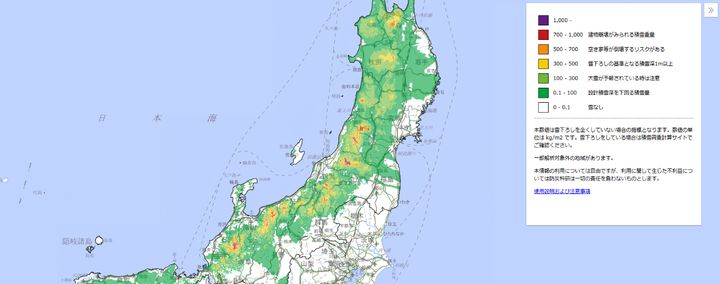 雪下ろしの必要性を判断する際には、防災科学技術研究所が提供している「雪おろシグナル」が便利です。雪おろシグナルでは、地域に降り積もった雪の重さに基づき、危険度が色分けされています。