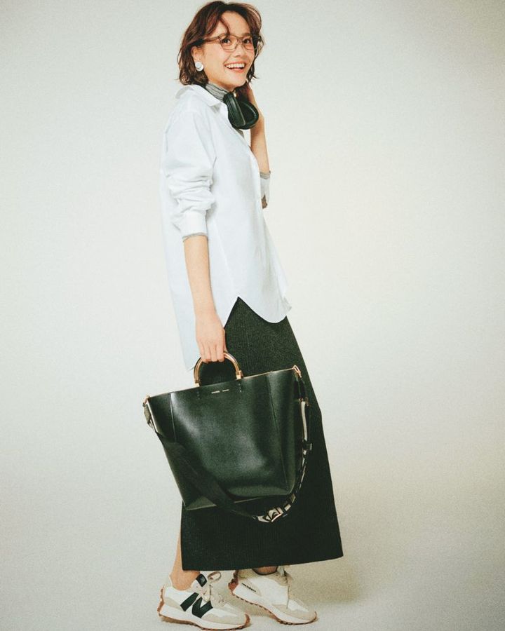 スニーカー¥13,090(ニューバランス/ニューバランスジャパンお客様相談室)シャツ¥14,960(インディヴィ/ワールド プレスインフォメーション)カットソー¥10,450(ザ ポーズ/ウィム ガゼット ルミネ新宿店)スカート¥9,990(PLST)バッグ¥143,000(ザンケッティ/八木通商)メガネ¥22,000(フルラ/デリーゴジャパン)イヤリング¥11,550(マージョリー・ベア/ココシュニック 新宿タカシマヤ店)