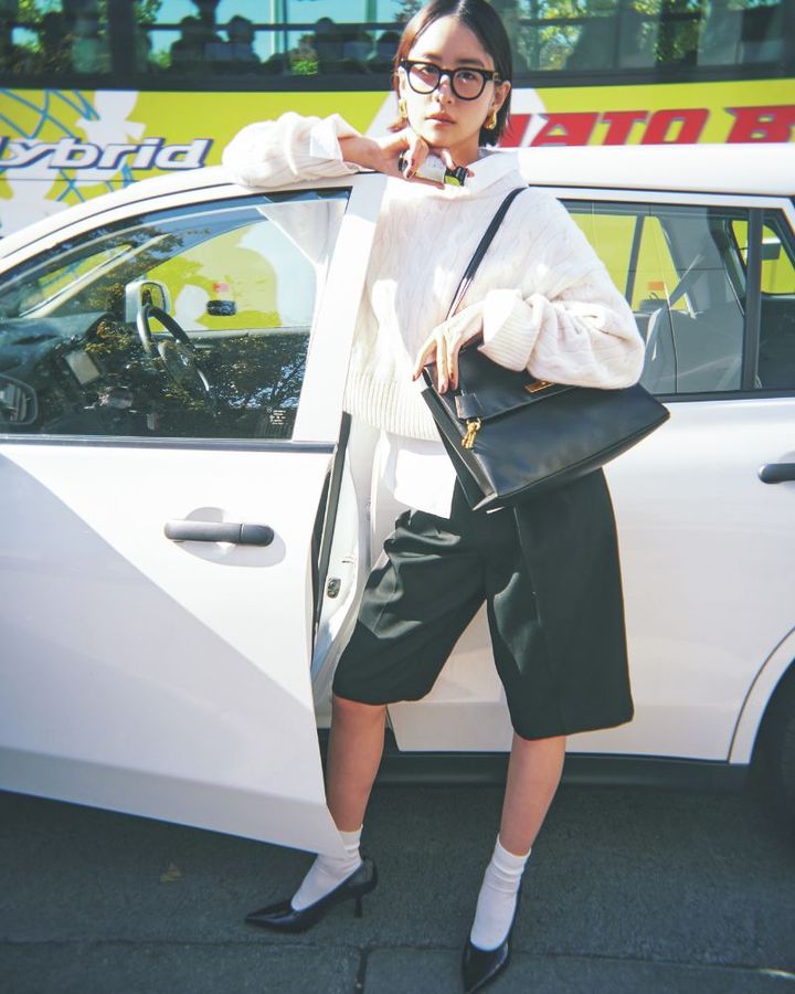 カジュアルなイメージのハーフパンツを通勤できこなすなら、場違いにならないようセンタープレス入りのフォーマルな素材を選んで、オフィス仕様に。さらに全体をモノトーンでまとめつつ足元は「白ソックス×黒パンプス」で遊び心を加えれば、大人モードな着こなしに一変します。マニッシュにならないようトップスは白シャツとニットのレイヤードでキレイめにまとめるのがコツ。