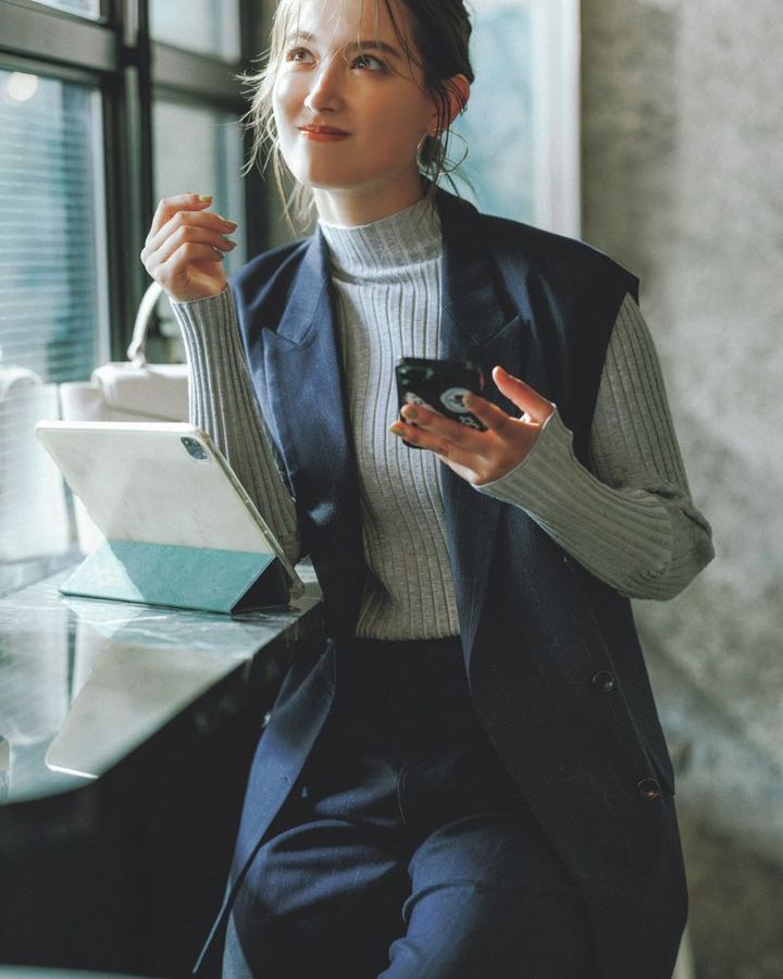 シーズンレスかつオンオフ兼用できるジレは、働くアラサーのワードローブに必要不可欠なアイテム。この冬はアウターの下にジレを仕込んで重ね着を楽しみつつ、オフィスではタートルニットとのコンビネーションで知的な雰囲気を。ネイビー×グレー配色なら重すぎず、品格たっぷりに着こなせます。セットアップのパンツを選べば、好印象な通勤コーデの完成です。
