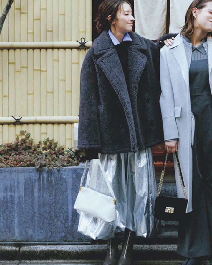 いつもは無難なシンプコーデも、女子会や旅行となればどこか物足りない…。そんな日こそ、1点投入で感度が高まるシルバースカートを投入して、ほんのりモードな遊び心を。アウターは同系色のグレーコートをあわせて、コーデに一体感を引き出すのがコツ。シャツ×ニットやレザーアイテムという真面目なアイテムを細部に足して、キレイめにまとめると、スカートが引き立ち高バランスに仕上がります。