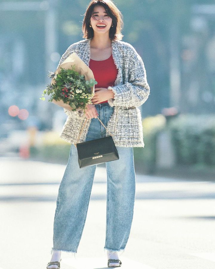 毎年ベーシック派に華やぎを与えてくれるツイードジャケットは、着こなしに変化をつけて更新を。今年は薄色のデニムパンツと合わせて抜け感を意識。丸いカーブを描いた優しげなフォルムで、ヘルシーな女性らしさを意識するとうまくいきます。カジュアルになりすぎないよう、赤ニットを投入してエレガントな表情にまとめると、ツイードの品格も相まって洗練度された着こなしに。
