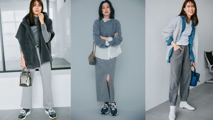 シンプルなスウェットコーデは グレーのワントーンで大人に。 白カットソーのチラ見せで洗練される
