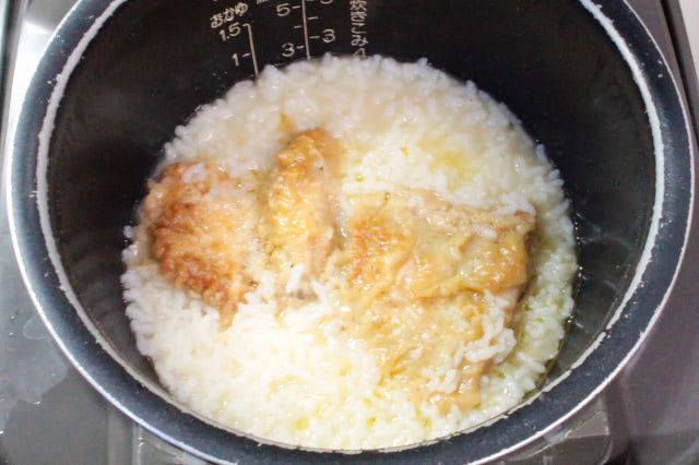 2.炊飯器に水を切った1、おかゆ1/2合分の水、塩を入れて軽く混ぜ、オリジナルチキンを乗せておかゆモードで炊飯します。