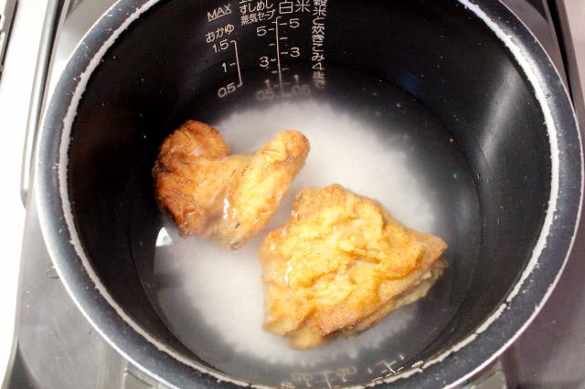 オリジナルチキンには骨が付いているので、炊飯器で炊き込むと肉と骨から旨味が出るのでしょうね。オリジナルチキンの新たなおいしさに出会えるようなので、作ってみます♪