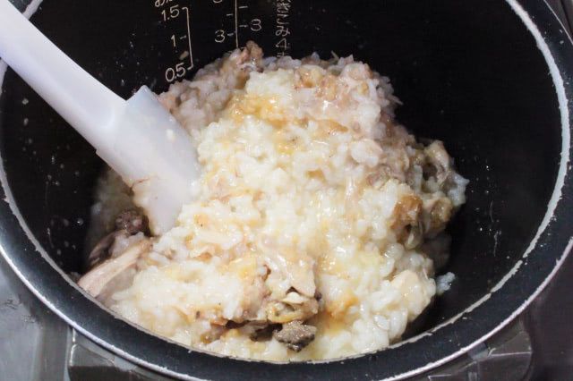 3.炊けたらオリジナルチキンを取り出してほぐし、炊飯器に戻して全体を混ぜ合わせます。