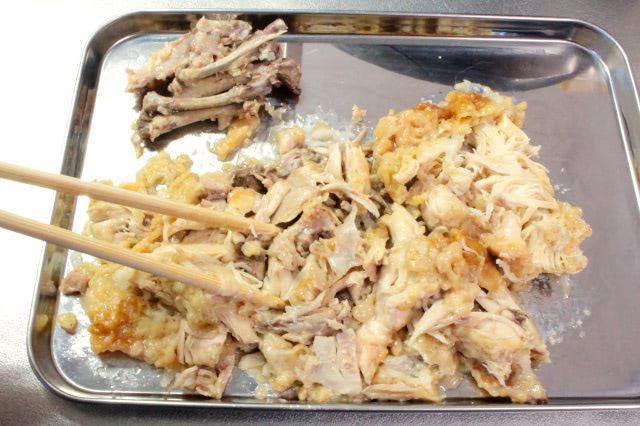 オリジナルチキンを粗くほぐし、中に入っている骨を取り除きました。