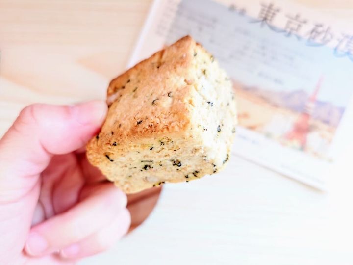 必食は、東京限定「東京砂漠スコーン」。全粒粉をたっぷり使ったザクザク食感を楽しめる四角いスコーンです。