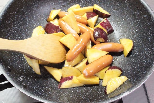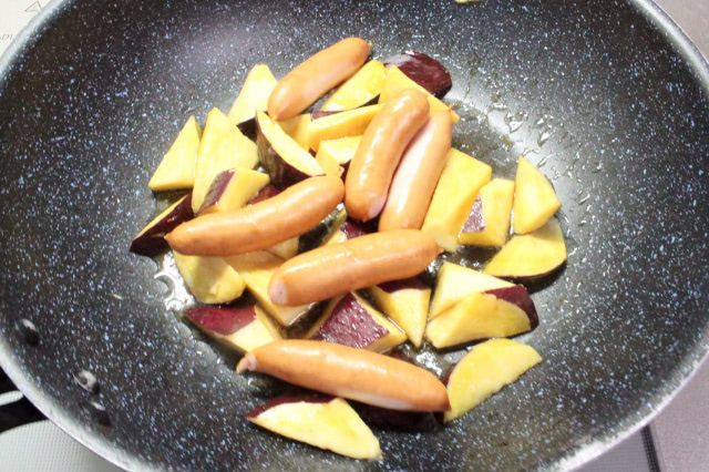 ほんのり甘辛いお芋にシャウエッセンの塩味と旨味がマッチ♪