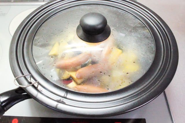 4.さつまいもをひっくり返してシャウエッセンを乗せ、フタをして1分蒸し焼きにします。