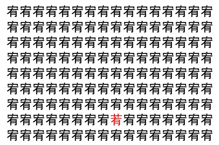 画像の中には、「宥」という漢字が縦に9行、横に16個並んでいます。 全部で144個となりますが・・・、そのうち1つは「異なる漢字」となってますよ!!