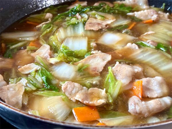 7.酒を入れてさっと混ぜ、フタをして弱めの中火にして、2分間蒸し焼きにします。そうすることで白菜の甘味が増すそうです。