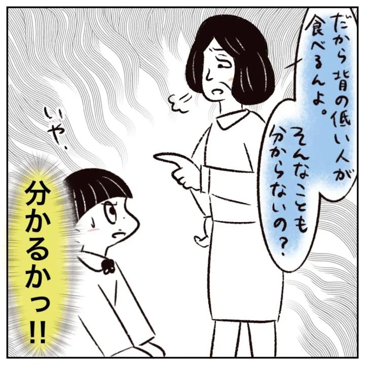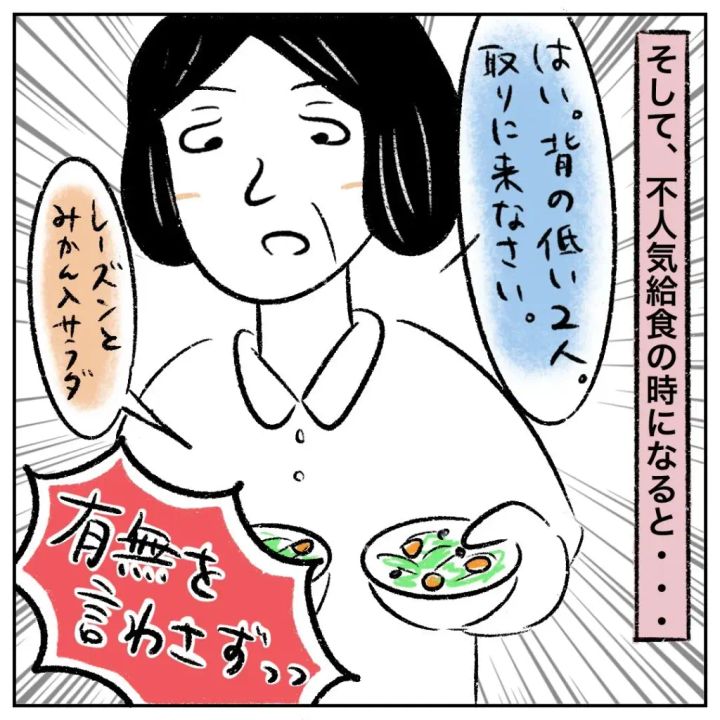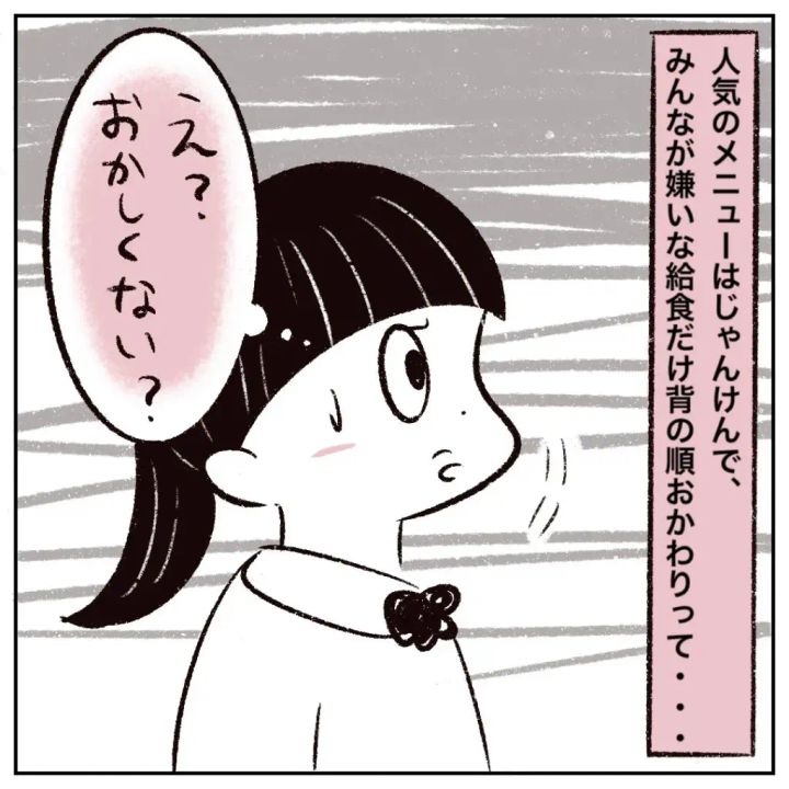 先生の言葉に、「え?おかしくない?」と思ったまるさん、「人気のメニューはじゃんけんで、その他はみんなが嫌いな給食だけ背の順におかわりって・・と思いました。