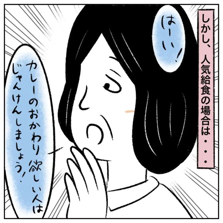 そして人気給食だった場合は、「はーい!いカレーのおかわり欲しい人はじゃんけんしましょう」と先生が言いました。