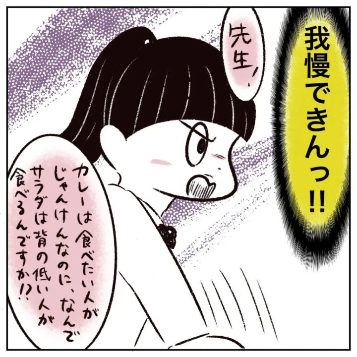 そして、「我慢できん!」と「カレーは食べたい人がじゃんけんなのに、なんでサラダを背の低い人が食べるんですか!?」そうたずねると、