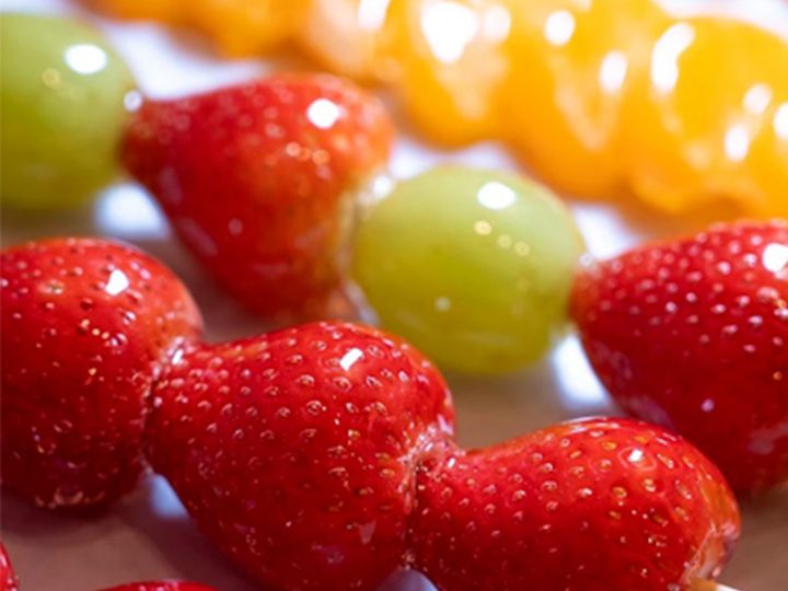 「いちごぶどうあめ」は、パリッとジューシーな「いちごあめ」と、プチッとはじける「ぶどうあめ」が交互に刺さったぜいたくな1本。イチゴとブドウを一緒に味わえる満足感たっぷりのメニューです。