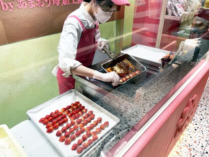 お店に入った瞬間から感じるイチゴの香りと、次々にでき上がっていくいちご飴を眺めることで、よりおいしさとトキメキを感じてもらえる店を目指しているのだとか。※飴付けの時間帯は不定期